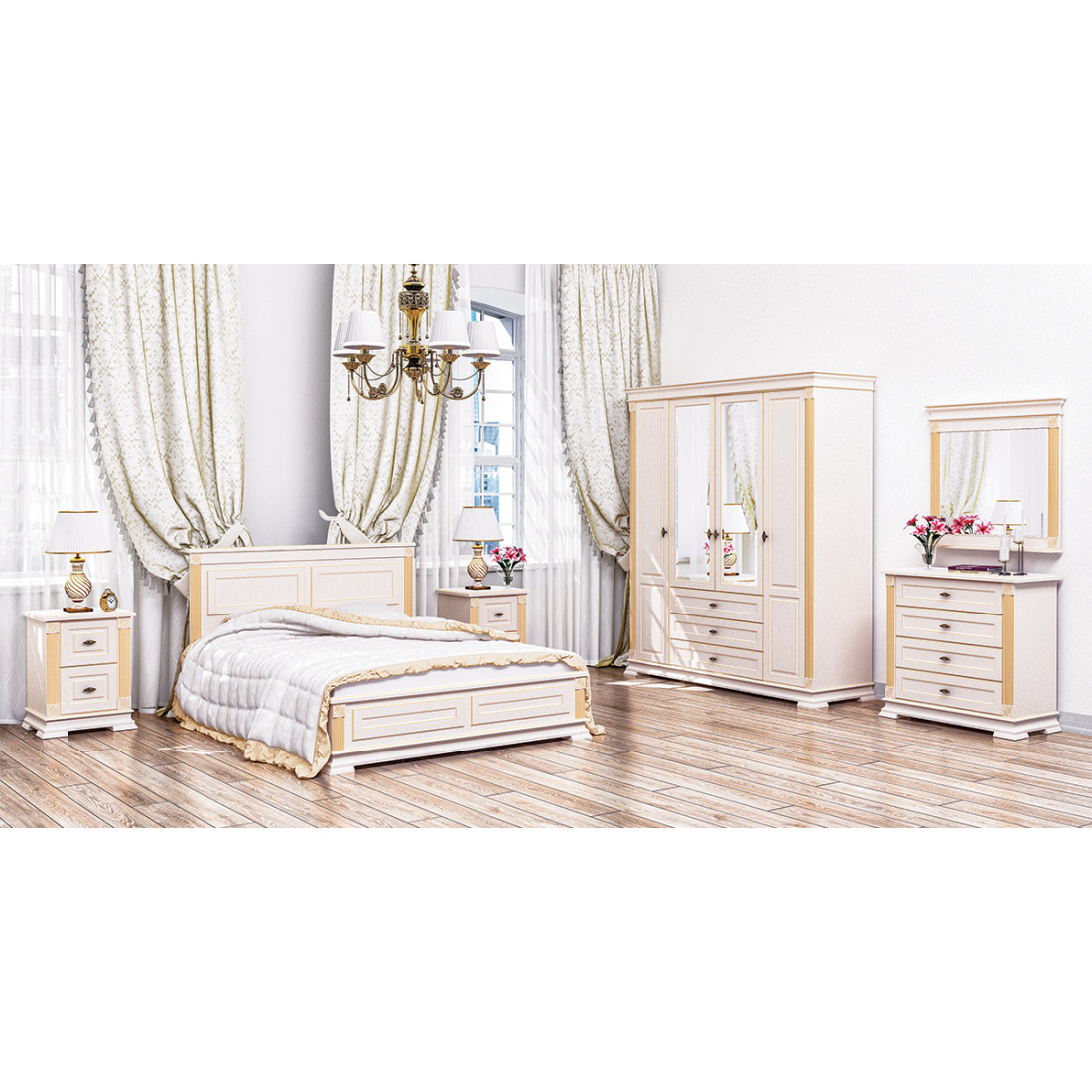 Бельевой комод для спальни МН-222-11 новой серии Афина от Мебель-Неман выполнен в цвете "крем с золотой патиной".