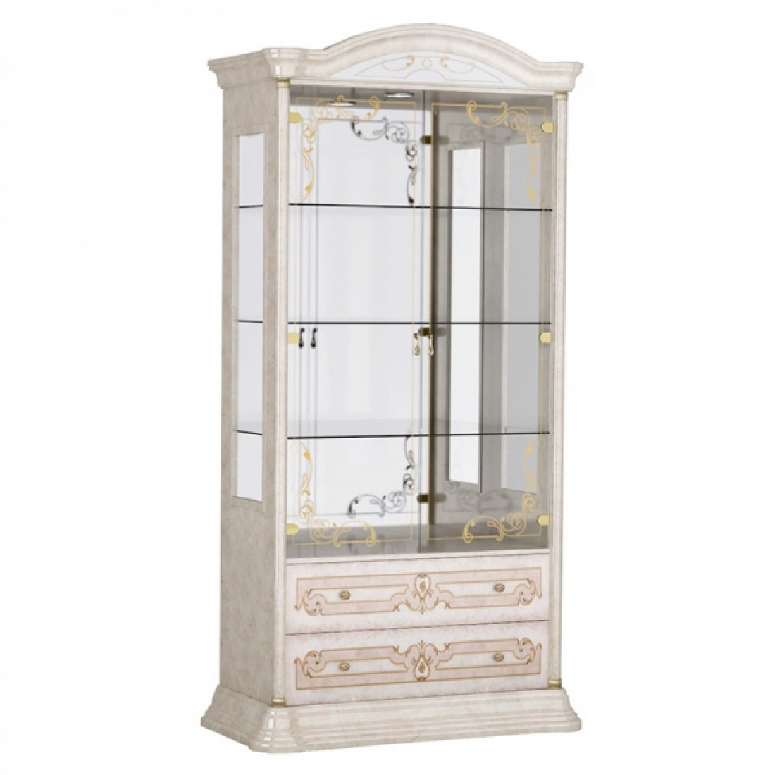 Шкаф-витрина двухдверная Роза (беж) от фабрики ДИА мебель выполнен в классическом стиле. Стеклянные полки и зеркальный корпус придадут чувства легкости и удивят Вас своей вместимостью. Бежевый цвет в сочетании с глянцевым покрытием и золотистым орнаментом придает этой модели изящность. Такой шкаф послужит идеальным дополнением к другим модулям коллекции.