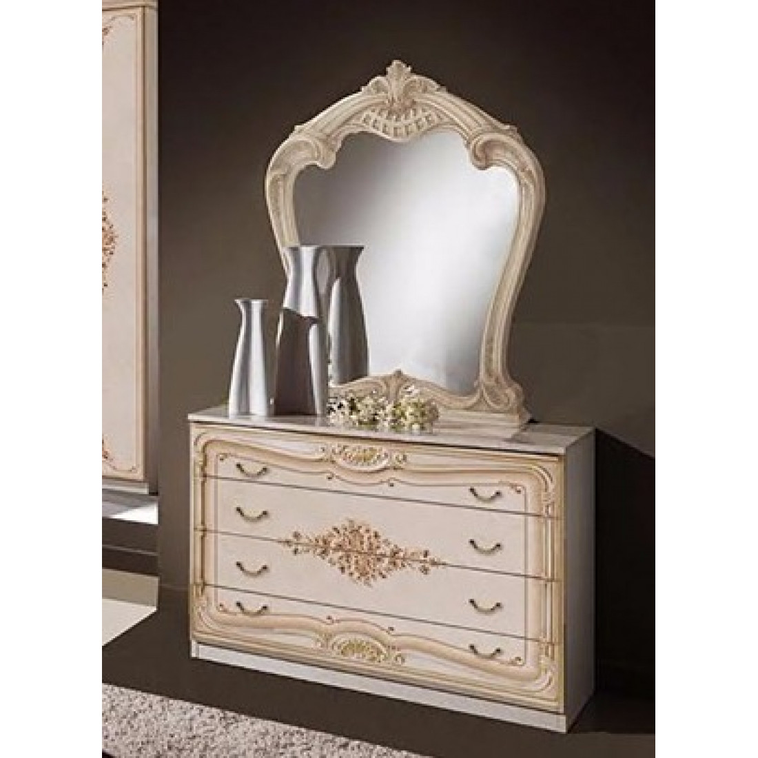 Комод с зеркалом Диана (беж) от Российской фабрики «ДИА мебель» выполнен в бежевом глянцевом цвете. Большое зеркало с легкостью украсит и визуально расширит и осветлит комнату. Такой комод в классическом стиле не займет много места, будет незаменимым модулем в вашей спальне.