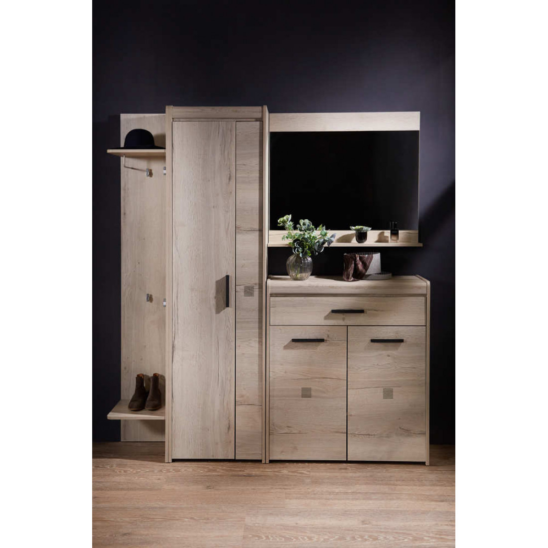 Прихожая «Мале» - обладательница лаконичного и свежего дизайна. Особое внимание привлекают тактильные ощущения от прикосновения к мебели. Декор и структуры, схожие с натуральным деревом по рисунку и шероховатости, придают глубину и естественность. Широкий спектр модулей позволит эргономично использовать Ваше пространство.