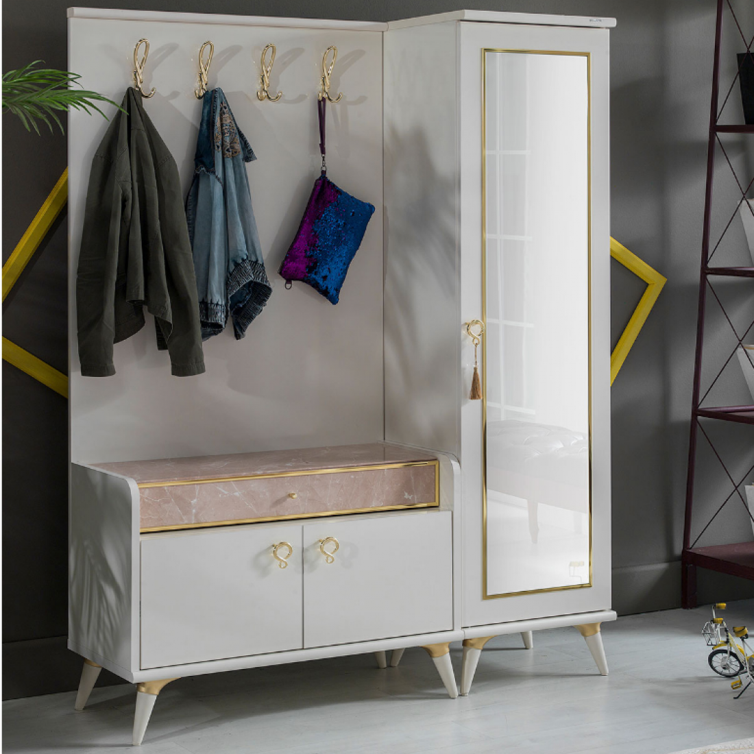 Прихожая Monreal Bellona очень функциональная, в ней есть деревянные полки, выдвижной ящик для мелочей и панель с крючками для верхней одежды. Есть куда поставить сумочку, убрать обувь. Можно дополнить узким шкафом с полками. Серия снята с производства.